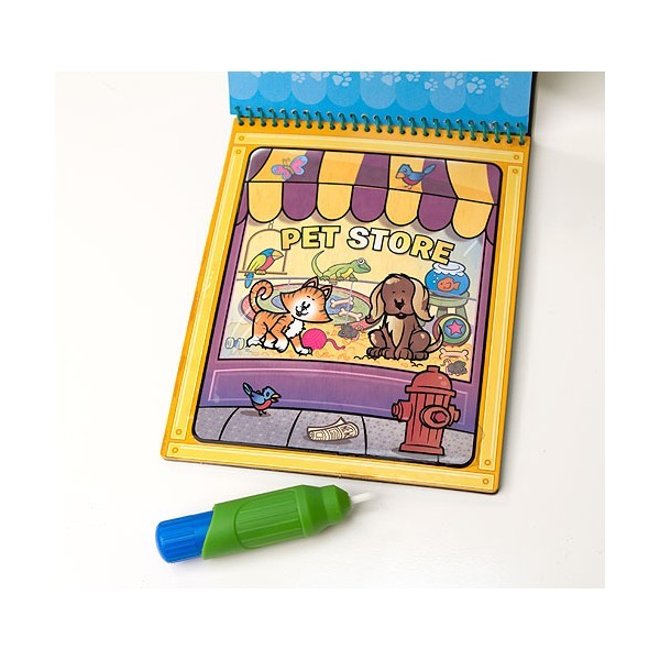 Carnet de colorat Apa Magica - Animale Acest carnet cu activitati include 4 pagini reutilizabile si stiloul-pensula pentru apa, cu sistem de reumplere. Umpleti stiloul cu apa si treceti varful peste paginile carnetului pentru a vedea cum imaginile ascunse apar ca prin minune! Fiecare pagina include o activitate de tip cauta si descopera cu animale. Dupa ce ati terminat, lasati doar sa se usuce pentru 10-15 minute, timp in care imaginile vor disparea si o puteti lua de la capat. Nu va speriati daca imaginile dispar - le puteti vedea din nou "colorandu-le" doar cu apa. Stiloul cu apa este dimensionat astfel incat sa fie usor de tinut in mana de catre cei mici si are un compartiment spcial pentru pastrare in coperta carnetului. Goliti stiloul inainte de a-l aseza in compartimentul pentru pastrare sau atunci cand nu il folositi. Acest set ajuta la recunoastrea culorilor, dezvoltarea miscarilor fine si a coordonarii ochi-mana, invatarea numerelor si a numararii. Dimensiuni: 25 x 16 x 4 cm. Este un set ideal pentru calatorie
