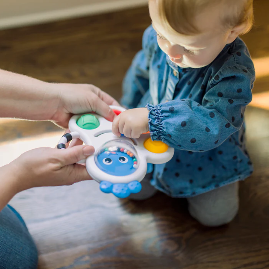 Micutul tau poate sa exploreze formele geometrice ale jucariei, poate sa gliseze micutul buton albastru pentru a porni diverse sunete, sa scuture margelele zornaitoare din interiorul jucariei si sa roada jucaria pentru a-si calma gingiile. Plina de beneficii pentru dezvoltarea armonioasa a micutilor, aceasta jucarie incurajeaza abilitatile motorii fine, creativitarea si descoperirea legaturii cauza-efect, in timp ce introduce in viata bebelusului culorile si formele geometrice.