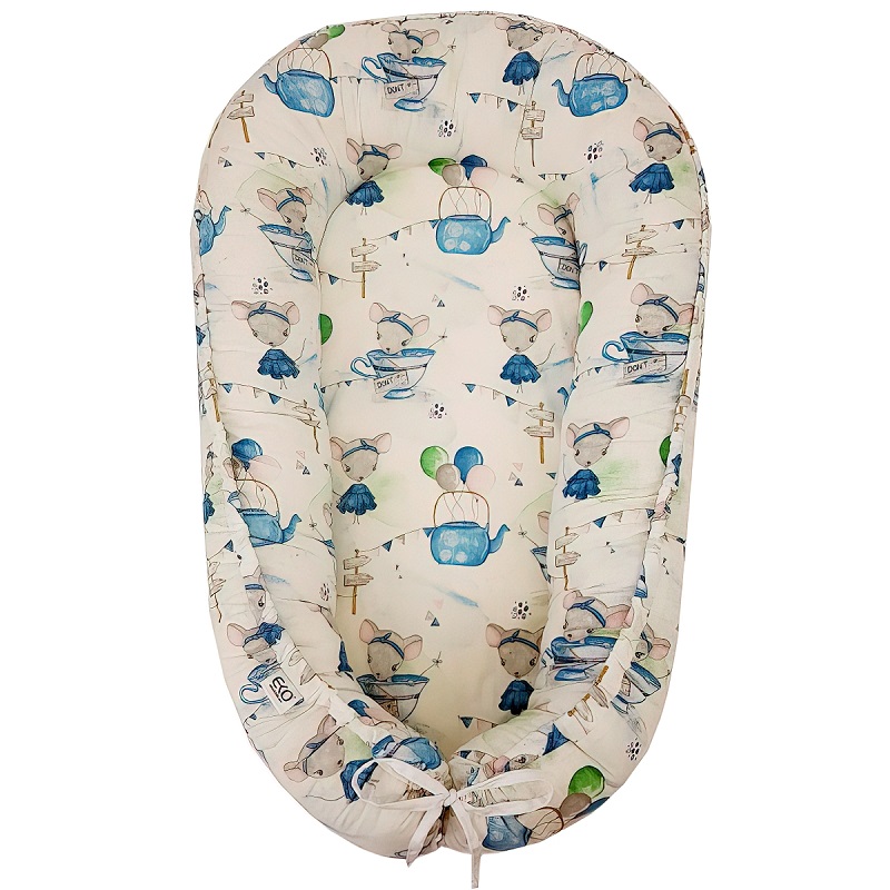 <p>Latime interioara: 30 cm</p> Baby nest din bumbac, Eko, Mouse Cuibusorul pentru bebelusi este realizat din bumbac 100% si umplutura din fibre de silicon.