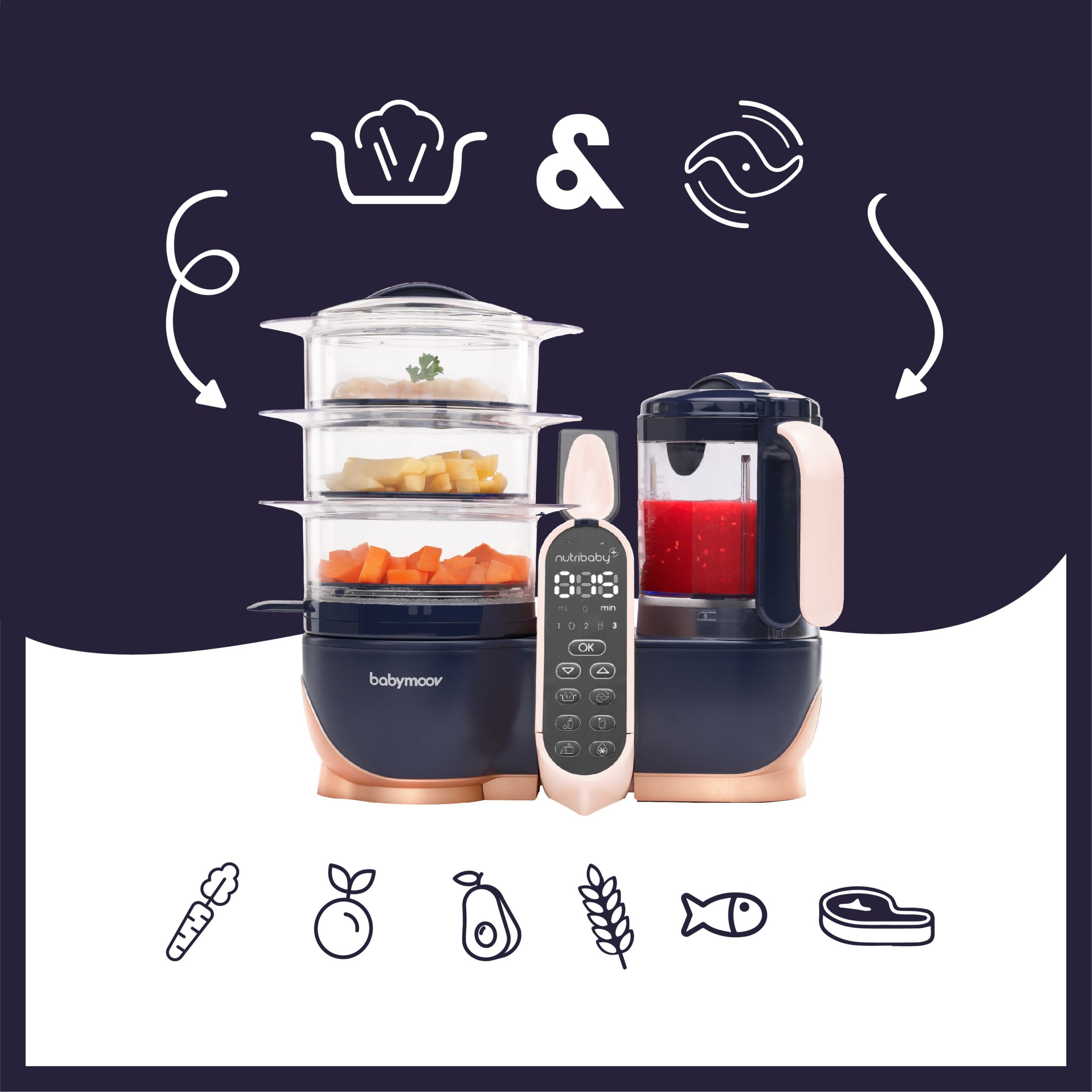 Pentru a va ajuta sa aveti un stil de viata sanatos, Nutribaby (+) XL va permite sa gatiti preparatele extrem de rapid, intr-un timp record - este dotat cu o consola centrala intuitiva si tactila cu 1 buton = 1 functie. Permite in acelasi timp atat gatirea la abur, cat si blenduirea mancarii. Astfel, gatitul devine simplu ca o joaca de copii!