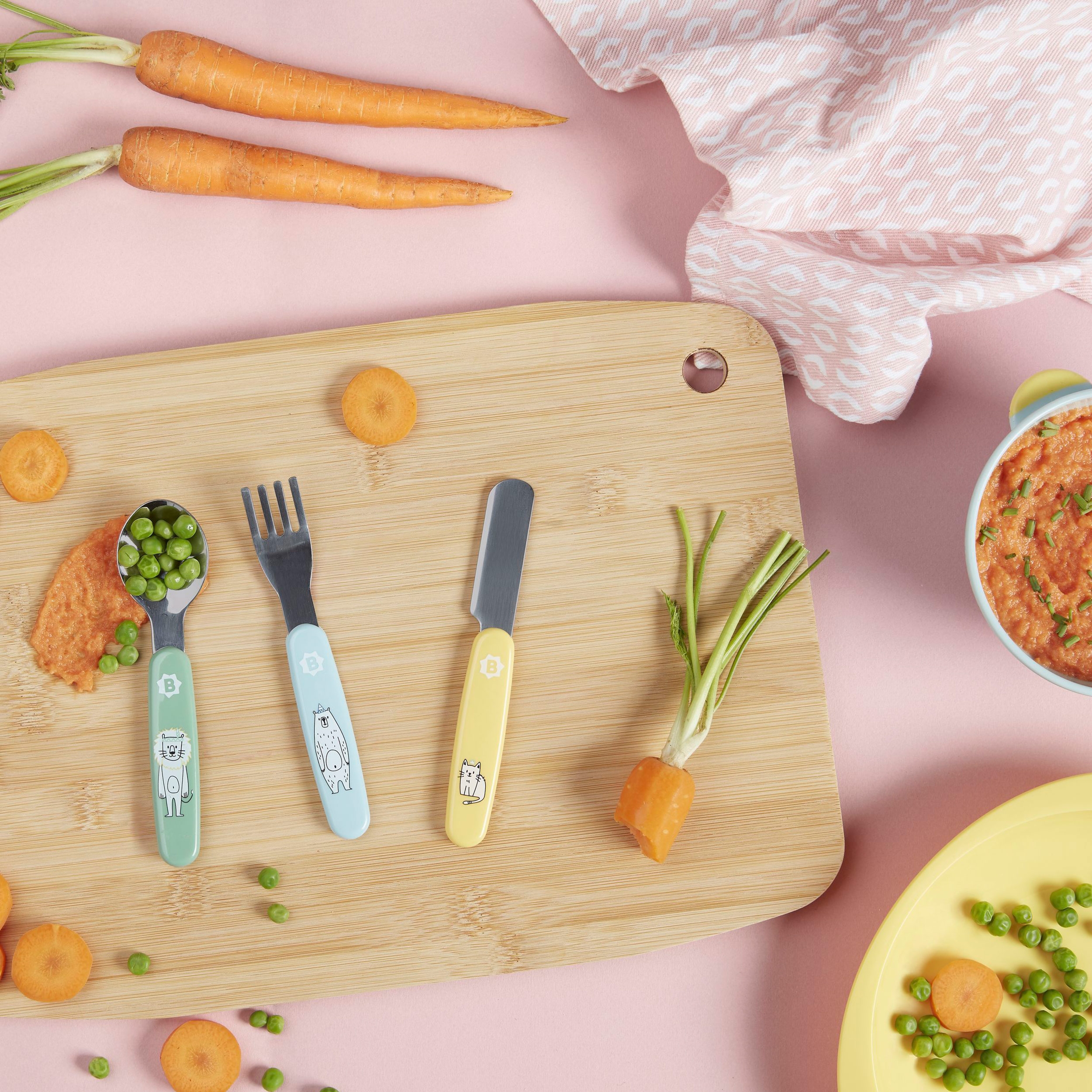 Setul de tacamuri este fabricat din otet inoxidabil, astfel incat acestea nu vor rugini. Manerele au un design simpatic, cu animalute vesele. Micutul tau va capata din ce in ce mai multa independenta atunci cand ia masa.