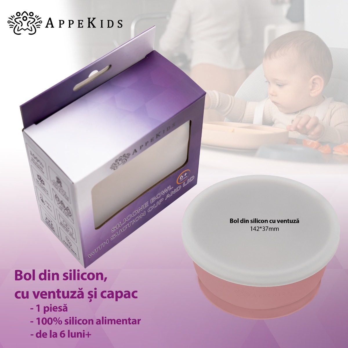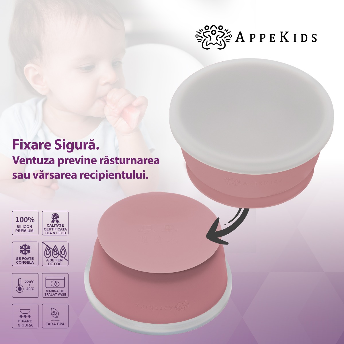 <p><strong>Bol din silicon cu ventuza si capac, AppeKids - Old Rose</strong></p>