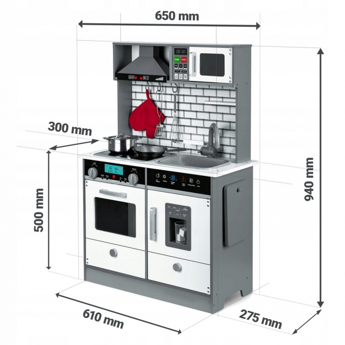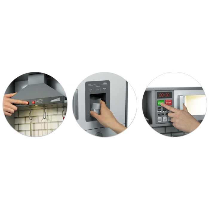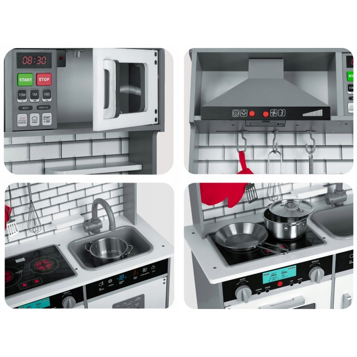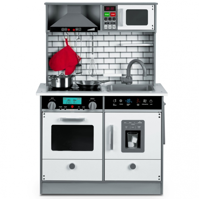 Bucataria este o jucarie educativa care ii va permite copilului tau sa se simta ca intr-o bucatarie adevarata. Datorita usilor care se deschid, butoanele aragazului care se invart si vaselor, copilul se va distra de minune dezvoltand abilitatile manuale in acelasi timp.