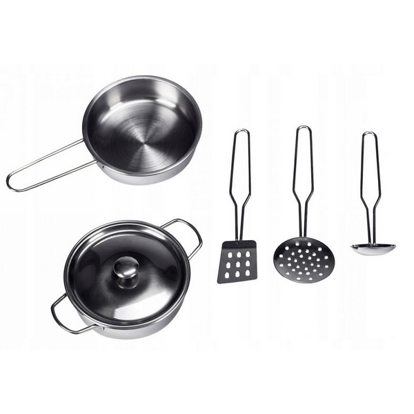 6 accesorii de bucătărie metalice : tigaie, oală cu capac, 2 palete cu găuri pentru strecurat și un polonic