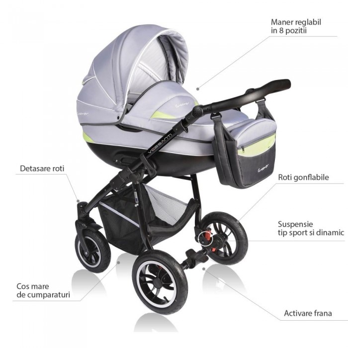 Cadru usor, roti mari gonflabile care fac fata la cele mai accidentate terenuri, culorile atent alese sunt doar cateva caracteristici, care fac din Vessanti cel mai cautat model de carucior.