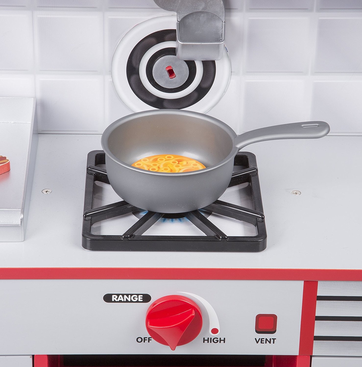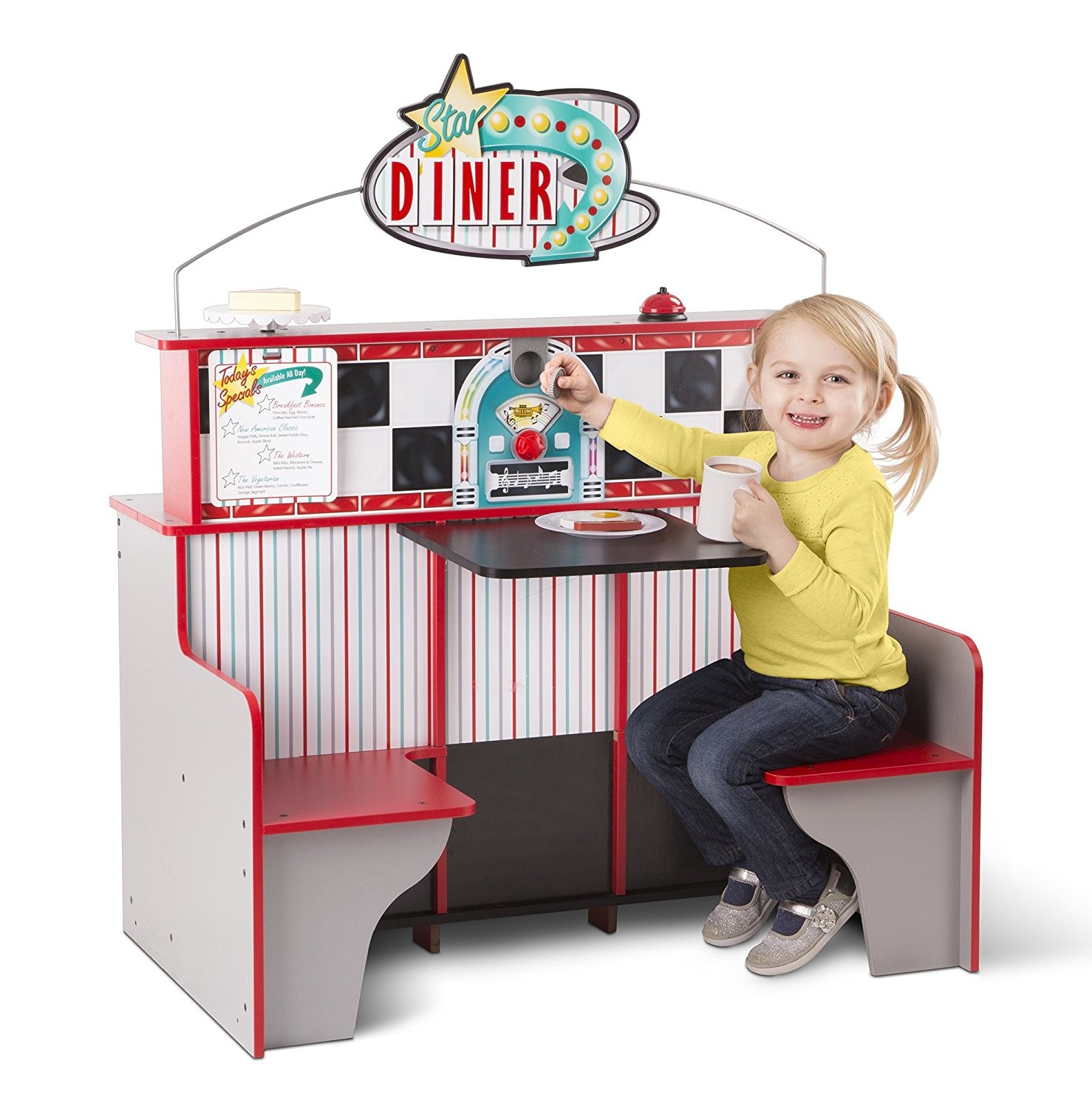 Colt de joaca Restaurant Star Colt de joaca din lemn cu doua parti: pe o parte se afla un scaune si o masa, iar pe cealaltaă parte are o bucatarie. Bucataria are cuptor, aragaz, gratar, frigider cu două rafturi, distribuitor de bauturi si mixer de lapte. Este inclusa o placa de tort rotativa pe tejghea si un semn cu cleme pe o parte pentru a tine meniurile.