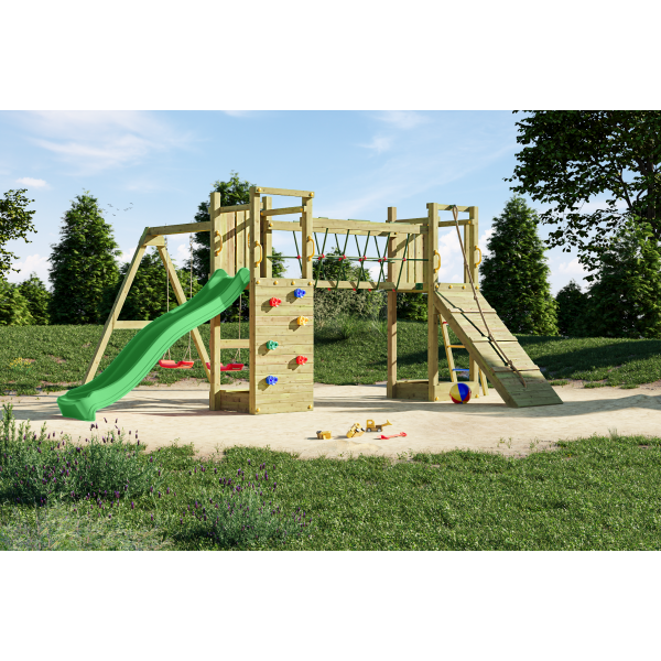 FUNGOO Maxi Exposure este un spatiu de joaca ideal pentru copiii activi care cauta in permanenta experiente noi. Multiplele forme de joaca vor oferi celor mici nenumarate oportunitati de a petrece timpul creativ. Podul este incantarea lor! Fungoo Maxi Exposure este gata echipat de joaca, cu accesorii incluse. Acest loc de joaca estea realizat conform tuturor standardelor CE si este complet sigur. Avantaje: - Tobogan rezistent de 2,2 m lungime
