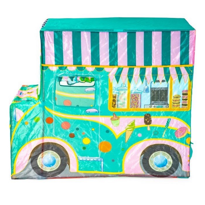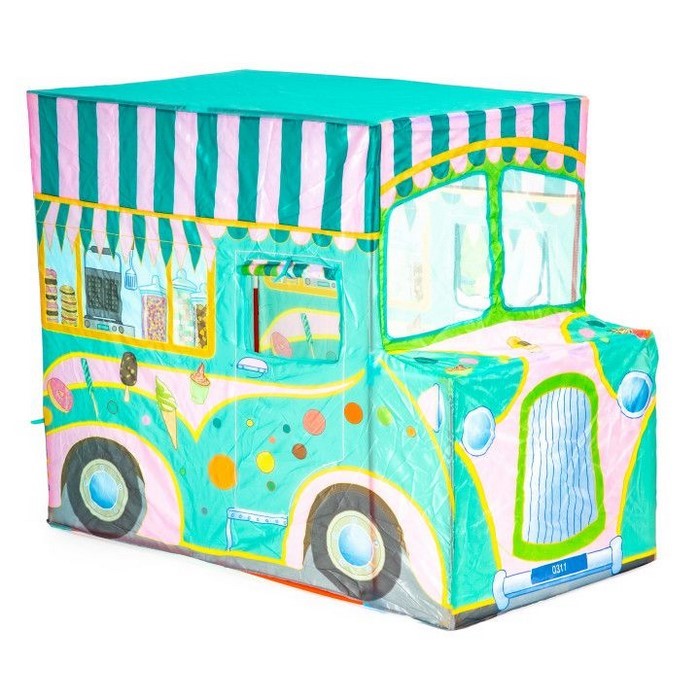 Tema si culorile cortului – o masina pentru livarea inghetatei - perfect pentru camera fiecarui copil. Cortul este fabricat din poliester, astfel incat poate fi asezat acasa si in gradina. Cortul are intrare. Cadrul cortului este format din tuburi si conectori din plastic, care sunt foarte usor de pliat si de desfasurat.