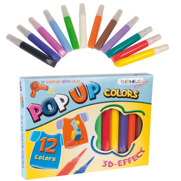 Set de 12 culori pentru pictat teasaturi, canvas, sticla, hartie, lemn si alte materiale. Instructiuni: pictati suprafata dorita (pentru tesaturi asezati un carton gros dedesubtul suprafetei pictate si fixati cu cleme de haine tesatura pentru a sta dreapta, dar fara sa fortati tesatura astfel incat sa stea tensionata) si apoi uscati cu uscatorul de par la temperatura mare pana cand vopseaua se "ridica" si capata un efect 3D. Dimensiuni tub vopsea: 15*110 mm. Dimensiuni cutie: 195 * 140 * 20 mm.