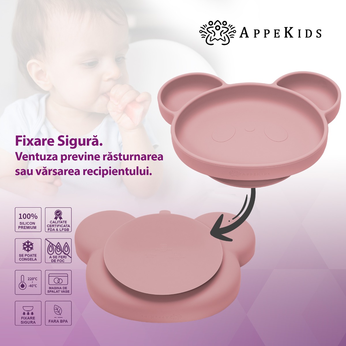 <p>Prin ardere la temperaturi foarte mari se descompune in substanțele din care a fost alcătuit.</p> Farfurie din silicon cu ventuza, AppeKids, Panda - Old Rose