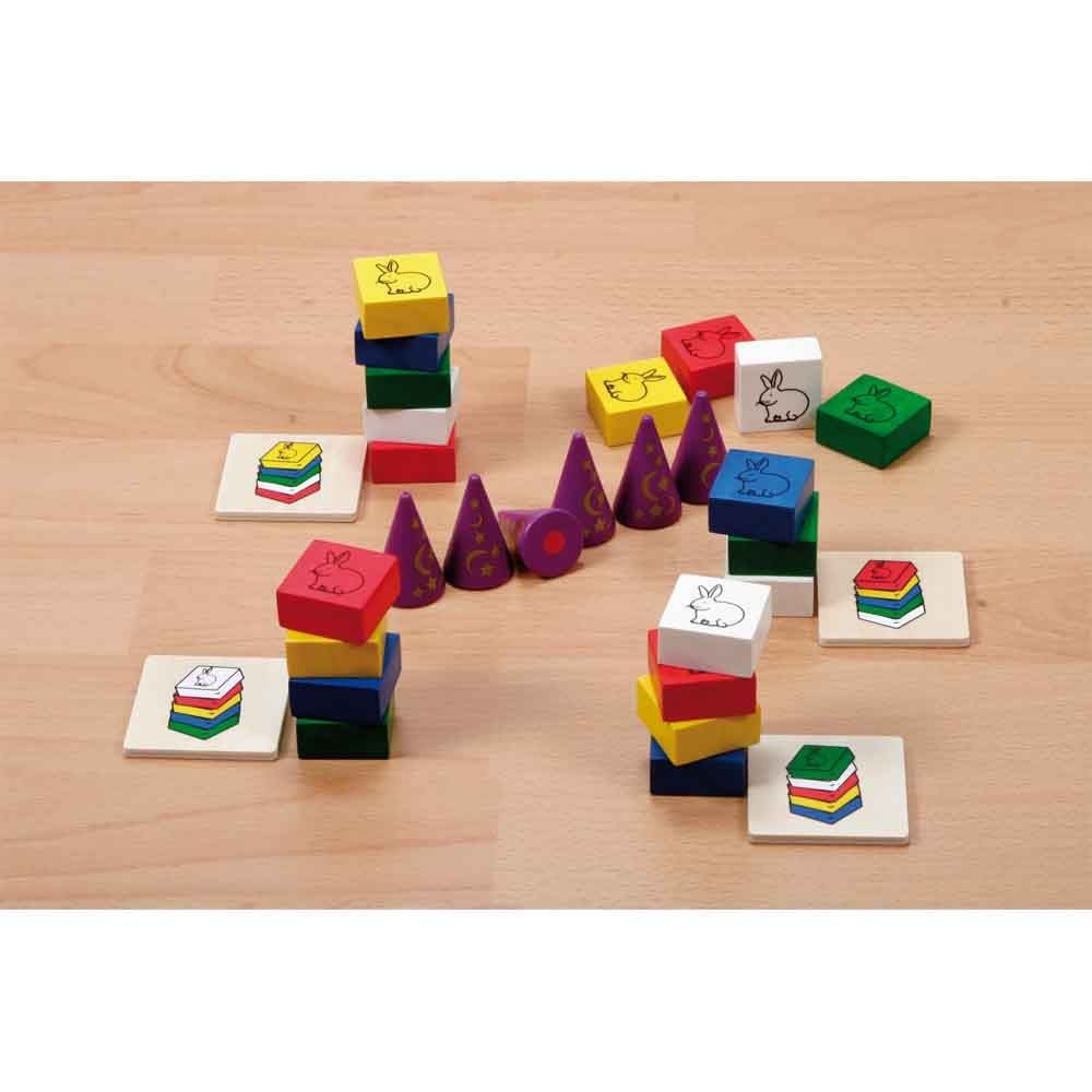 Jocul contine: 20 de caramizi din lemn colorate, 6 palariute de vrajitor si 4 carduri din lemn.