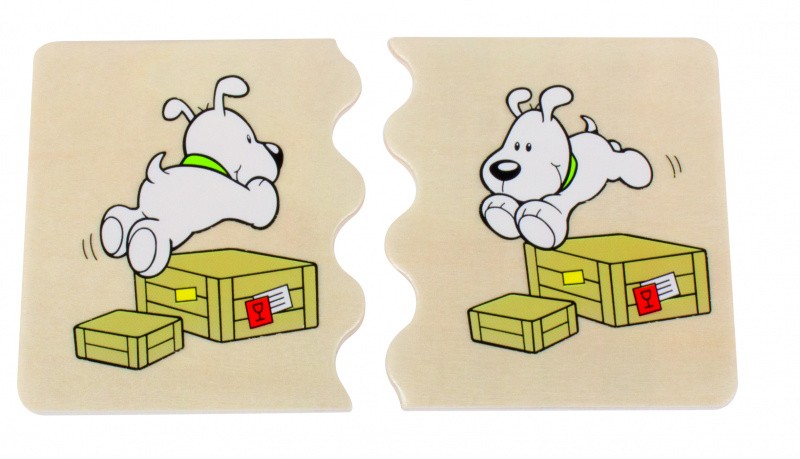 Puzzle-ul are ca sarcina principala recunoasterea diferentele spatiale, folosind propozitii corecte pentru a indica ce este obiectul in cauza si directia corecta a acestuia. Jocul contine 20 de piese lemn ambalate intr-o cutie de lemn.