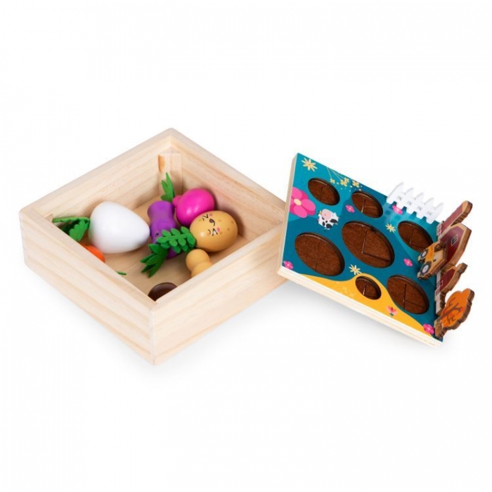 Cutia este realizata in intregime din lemn, iar constructia sa este sigura pentru copil. Setul este format dintr-o lada si 7 legume, care sunt asezate pe capacul cutiei. Jucaria dezvolta abilitatile manuale si va permite sa va extindeti cunostintele de baza despre legume.