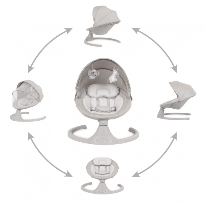 Functionarea silentioasa a motorului nu va impiedica copilul sa adoarma. Reglarea este in 5 trepte - a domeniului de oscilatie in lateral. Reglarea timpului de oscilare - 8, 15 sau 30 de minute. Contine si 10 melodii incorporate cu control al volumului.