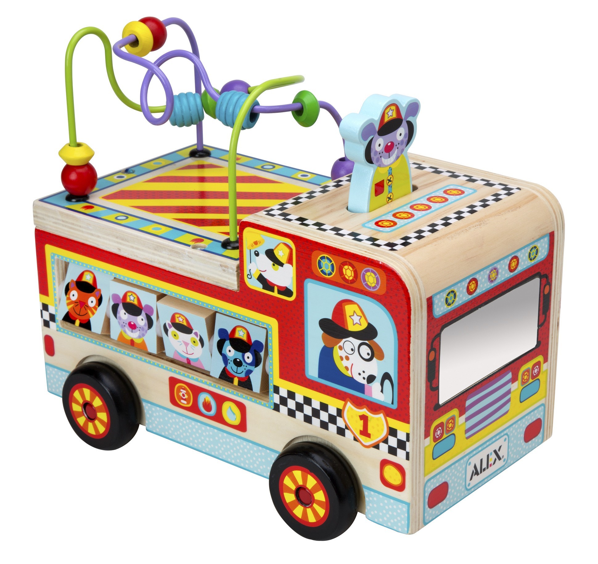 Masina de pompieri cu activitati Pompierii sunt in misiune si trebuie ajutati sa … se distreze si sa invete! Masinuta este "dotata" cu 8 activitati repartizate pe fiecare parte: roti care se invart, labirint cu bile, scara mobila, oglinda, roata dintata, piese care se rotesc, figurina mobila. Dimensiuni: 24 * 27 * 14 cm.