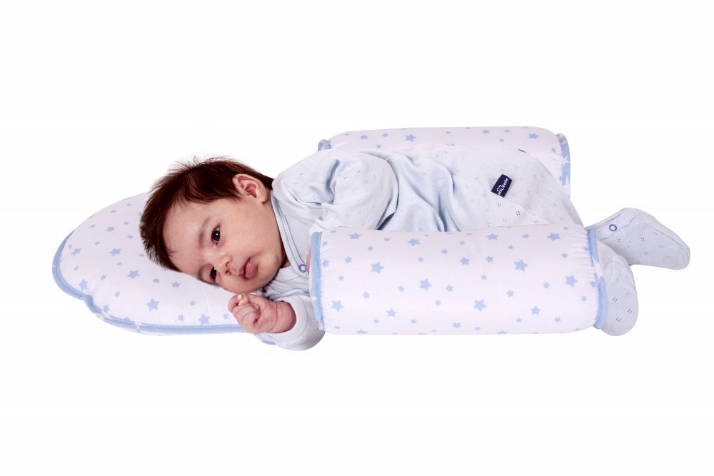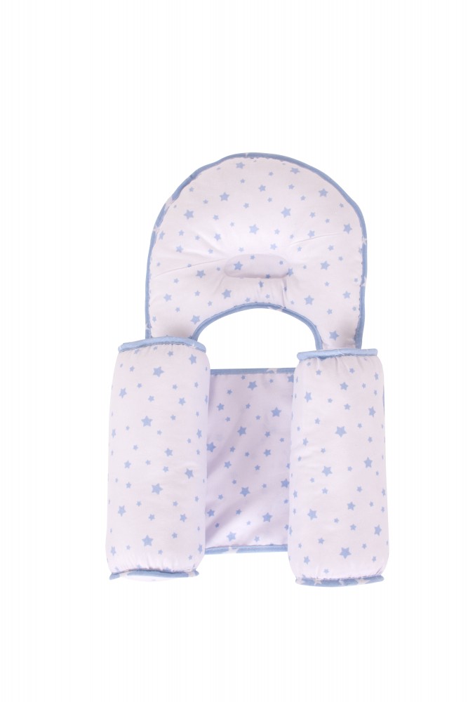 Pozitionator cu pernuta impotriva plagiocefaliei pentru dormit ce tine copilul culcat pe o parte, pozitie ce faciliteaza respiratia. Suportul este format din doua pernute confectionate la un unghi de 45 de grade,ajustabile cu ajutorul ariciului si o perna impotriva plagiocefaliei. Permite libertate completa de miscare a mainilor si picioarelor si impiedica "rostogolirea" bebelusului. Materiale : 80% bumbac si 20% poliamida. Dimensiuni aprox: (30x30x20)cm. Recomandat de la 0 luni +