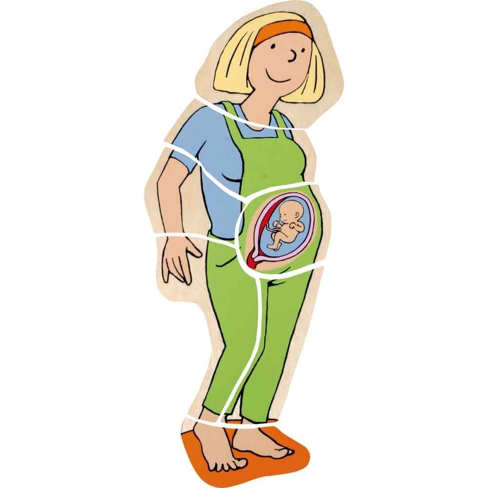 Puzzle stratificat din lemn compus din 27 de piese care alcatuiesc 5 imagini diferite ale varstelor bebelulului de la conceptie pana la nastere.