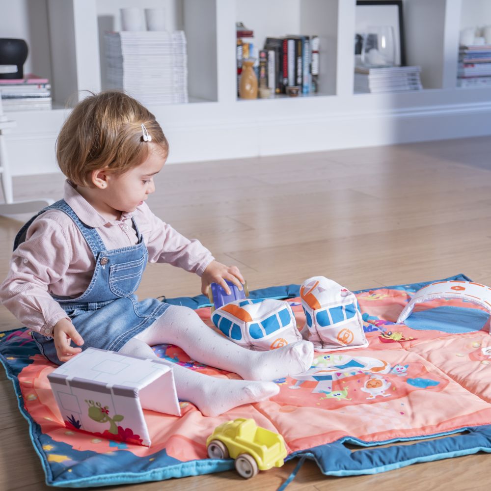 Cand sunt pliate, masinile sunt depozitate in interiorul saltelei, in timp ce un maner practic le permite parintilor sa o transporte confortabil.