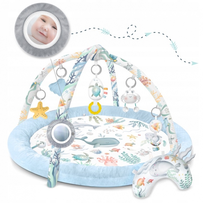 Aceasta salteluta educativa este extrem de colorata, moale si realizata foarte atent cu privire la estetica ei si la detalii. O salteluta colorata din tesatura va asigura o distractie sigura pentru cele mai tinere comori. Colorat cu mascote fericite, va sustine dezvoltarea copilului. Mobilitatea de a scoate mascotele va asigura o varietate de distractie inca din primele zile ale copilului. Deasupra saltelutei exista o banda/arcada cu jucarii colorate atasate pe ea. Cand copilul sta intins pe spate, se poate juca cu jucarii moi atasate la banda.