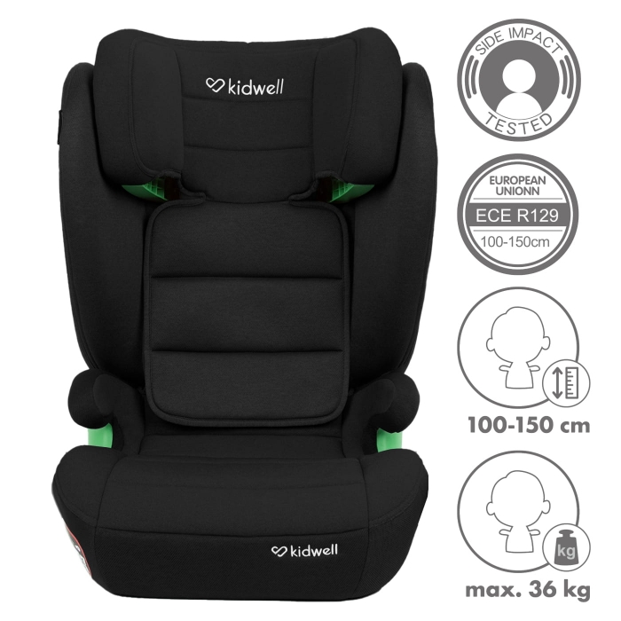 Scaunul auto Kidwell WESTON este conceput pentru copii cu o inaltime intre 100 - 150 cm. Datorita reglajului pe inaltime in mai multe etape a tetierei, scaunul creste odata cu copilul, poate fi folosit cu succes de la 3 pana la aproximativ 12 ani.