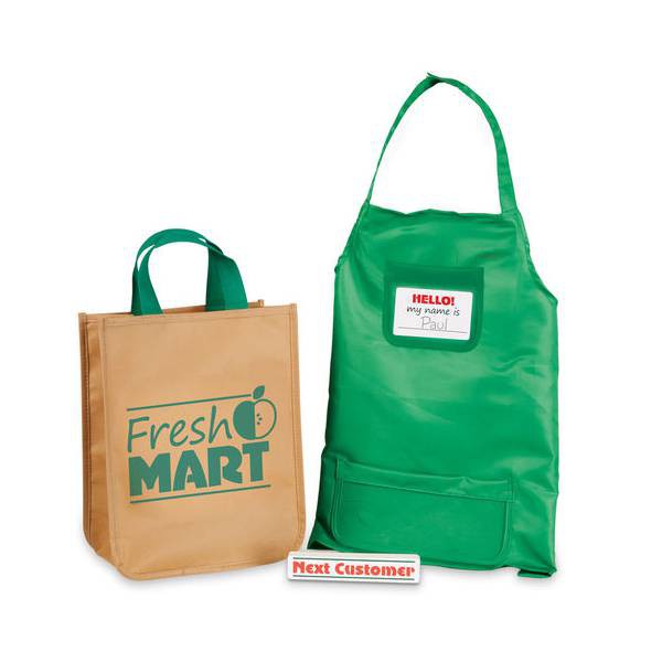 Set de joaca Accesorii Supermarket Melissa and Doug Setul include 70 de accesorii, printre care un sort, o bara de separare a alimentelor, o punga de cumparaturi, bani, cutii cu alimente, etc