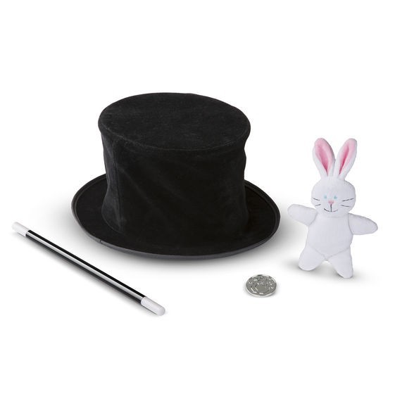Setul din 4 piese include o palarie de catifea cu buzunar secret, o bagheta, un iepure de plus si o moneda.