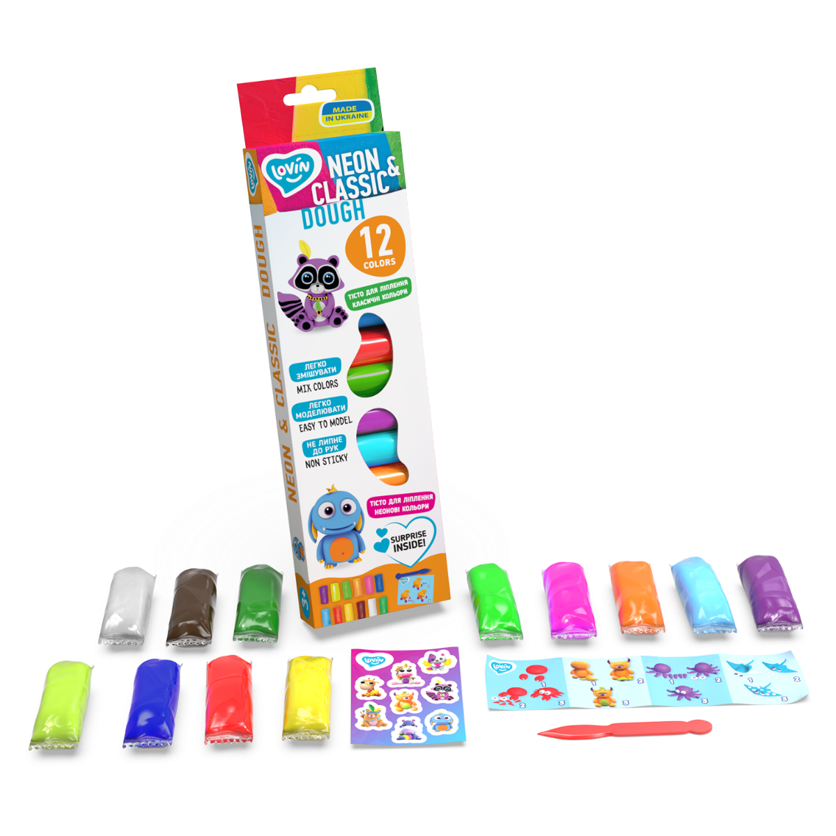 <p> </p> Set plastilina Lovin 12pcs*15gr - Neon&Classic Seria Neon și Classic constă din 12 bețișoare colorate de plastilina de culori mega strălucitoare și clasice adunate într-un singur set pentru fanii momentelor de „modeling”. Copilul va avea o gamă suficient