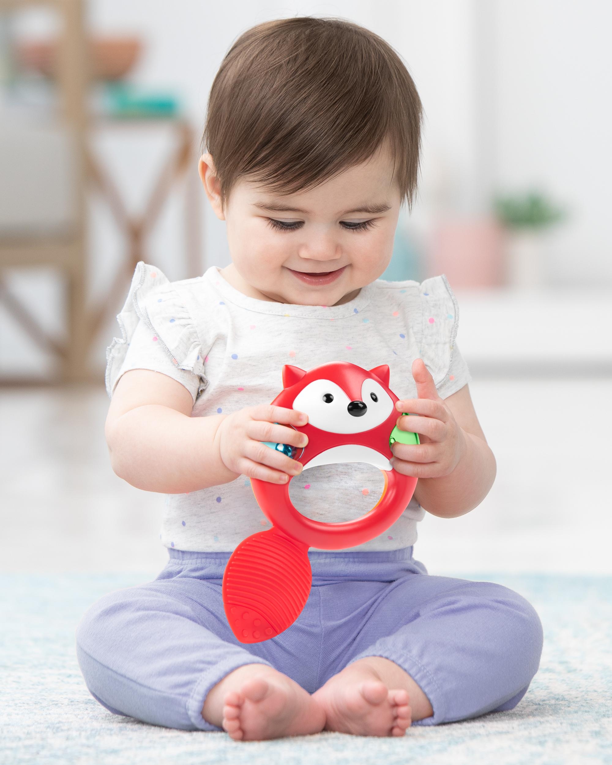 Tamburina vesela este mereu gata de distractie! Usor de tinut in mainile mici ale copilasilor, jucaria muzicala are si o portiune potrivita pentru dentitie.