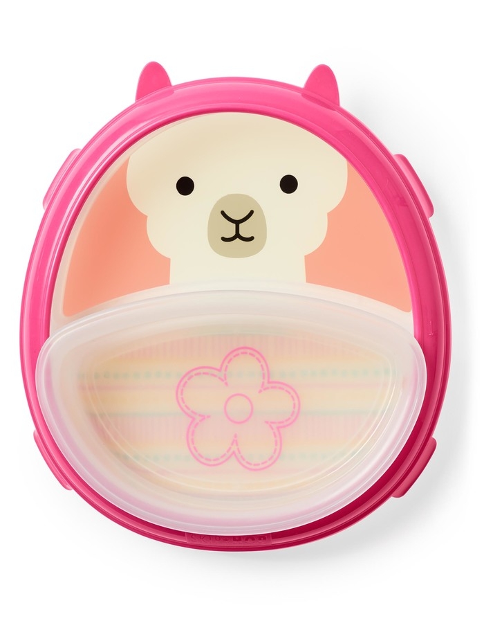 Conceput pentru a incuraja independenta copilului la masa de pranz, acest set format din 3 piese cu farfurie si bol reprezinta instrumentul perfect pentru a invata pe cei mici sa se hraneasca singuri. Dispune de o garnitura unica (cu urechi dragute), care poate fi detasata - cu scopul de a ghida alimentele, astfel incat mancarea ramane in castron si nu pe masa sau pe podea. Setul de trei piese contine o farfurie divizata cu doua sectiuni, garnitura speciala, plus un bol translucid care se potriveste perfect cu farfuria. Garnitura se fixeaza cu usurinta in functie de nevoile copilului. Fundul antiderapant previne alunecarea. Totul a fost conceput pentru mai putina dezordine in timpul meselor!