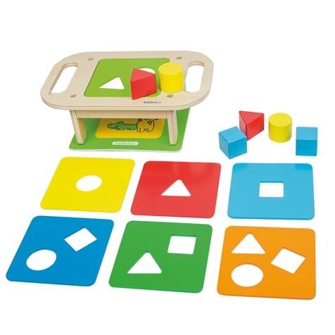 Sortator de forme Shapy Beleduc 7 placi de sortare diferite cu unu, doua sau trei orificii, astfel incat exista trei niveluri de dificultate. Jucaria promoveaza in special abilitatile motorii fine si coordonarea ochi-mana, ajuta la invatarea formelor si a culorilor..