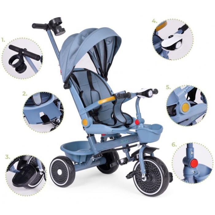 Datorita posibilitatii de dezasamblare a copertinei, a barierelor de siguranta si a manerului, tricicleta poate fi adaptata varstei si nevoilor copilului. Scaunul rotativ la 360° va permite sa va asezati copilul cu fata la dvs. sau in directia de mers, ceea ce creste confortul si interactiunea in timpul plimbarilor.