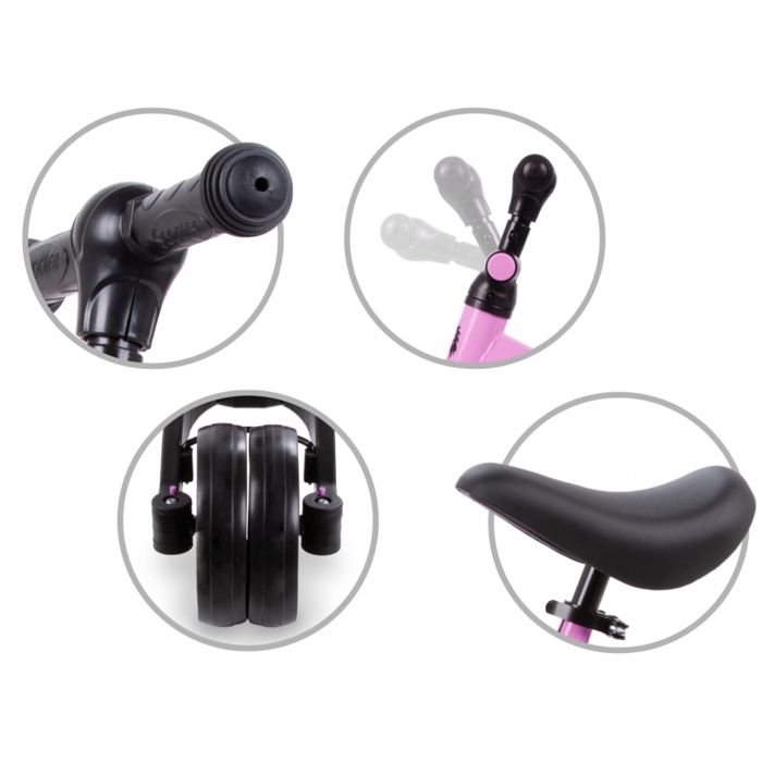 Bicicleta - pentru o stabilitate mai mare, desfaceti rotile din spate, copilul dvs. va incepe plimbarea cu mai multa incredere impingandu-si picioarele si intarind coordonarea motorie.