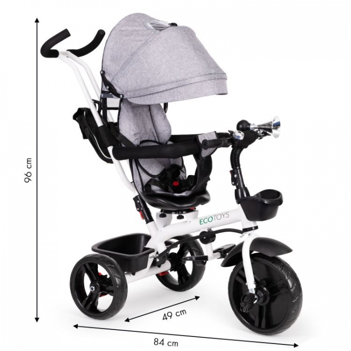 Compacta si usor de utilizat, tricicleta dispune de: un cadru din otel, parasolar pliabil, picioare pliabile, roti rezistente din spuma EVA, tija de directie ajustabila pe inaltime, frana si aparatoare de noroi, balustrade de protectie, vizorul pliabil care va proteja impotriva ploii si soarelui, imbinand astfel materialele de inalta calitate cu cele mai recente tehnologii in domeniul tricicletelor.