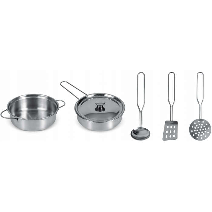 Setul include accesorii metalice perfecte pentru micutul tau. Setul include: o oala , o tigaie, un capac, un polonic si doua spatule.